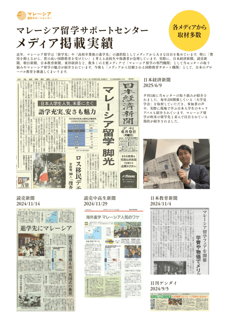 マレーシア留学サポートセンターは、年間500名以上の留学生を支援する「マレーシア専門」エージェントです。大学院進学のサポートも経験豊富。「15の大学進学留学サポート」で徹底的にあなたの大学進学をサポートします。